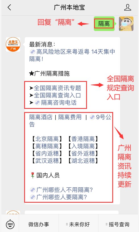 ▶回复 隔离 ,即可查询广州及全国最新隔离措施(隔离专题)、隔离费用、隔离酒店等。