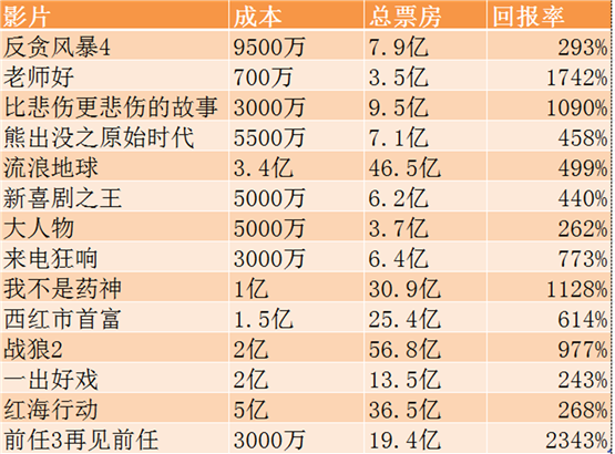 《我不是药神》,最终票房将近31亿元,投资回报率44.3倍,投资10万,票房收益443万;